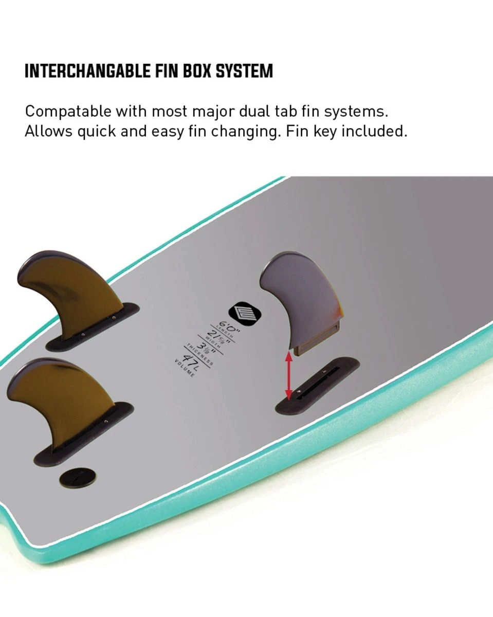 - Interchangeable Fin Box – Compatible with most major fin brands. Allows quick and easy fin changing. Secures with fin key (included).